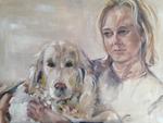 2014Muriel mijmerend ,samen met de hond op de bank